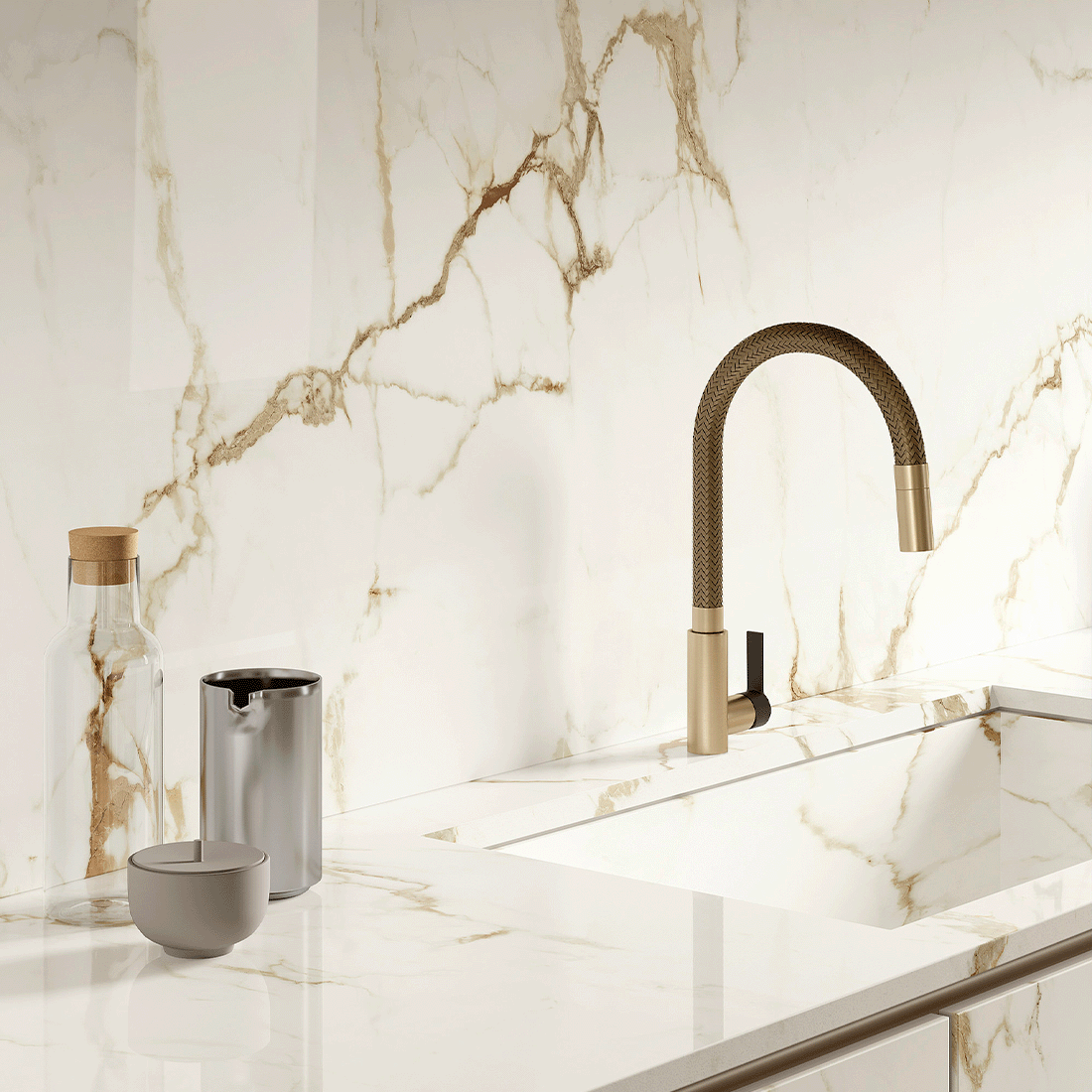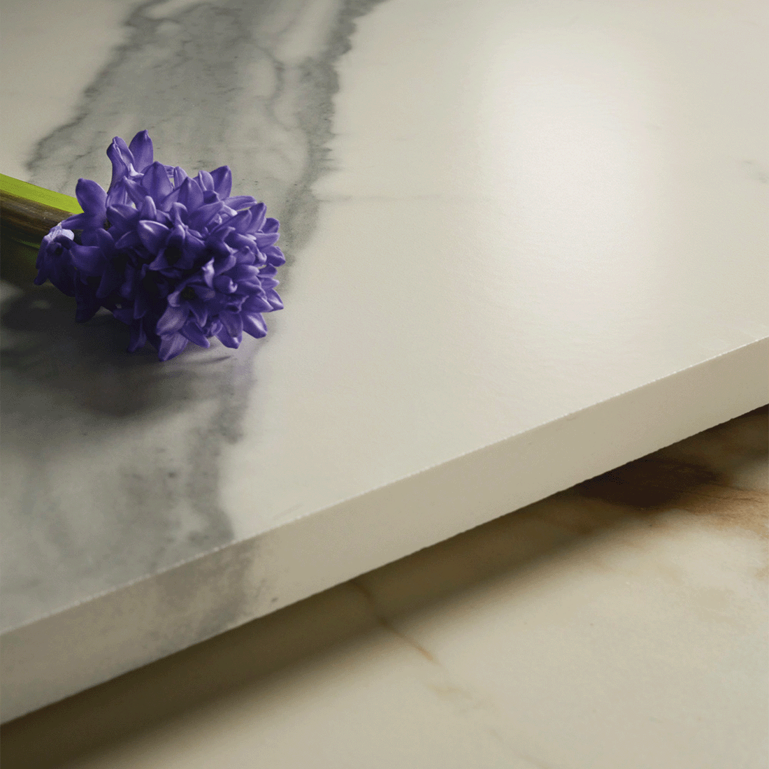 Castello is the most advanced form of porcelain kitchen worktop available and the only one currently on the market with veins running through the slab, making it the closest that you will get to real stone and marble. Other porcelain ranges have a plain coloured body, whereas this material shows the vein continuing through the full body of the slab. This means exposed edges can be polished and shaped with more classic edges such as ogee and torus. For this reason slabs from this range make fantastic kitchen worktops and bathroom vanity tops. Prices start from £550.77 per square metre.