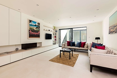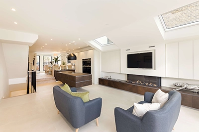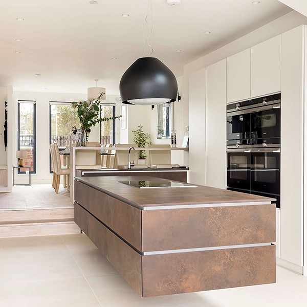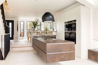 This stunning interior design project features sleek 120x120cm floor tiles that run throughout the ground floor, creating a sense of spaciousness and flow. The centrepiece of the kitchen is a striking floating island crafted from 12mm thick Coliseum Oxide Bronze porcelain slabs. These industrial-style slabs blend functionality with modern elegance.