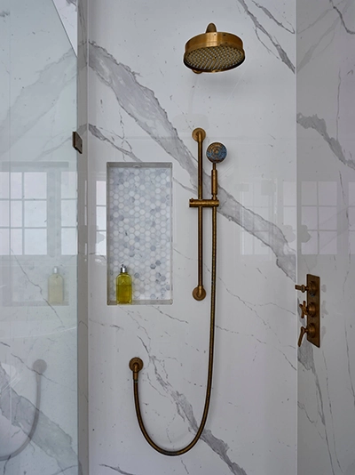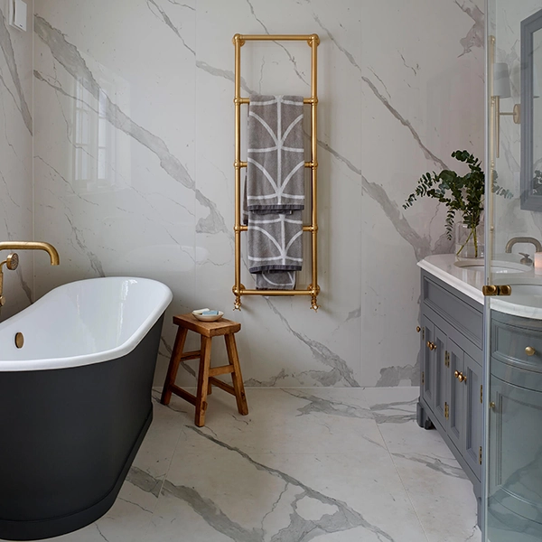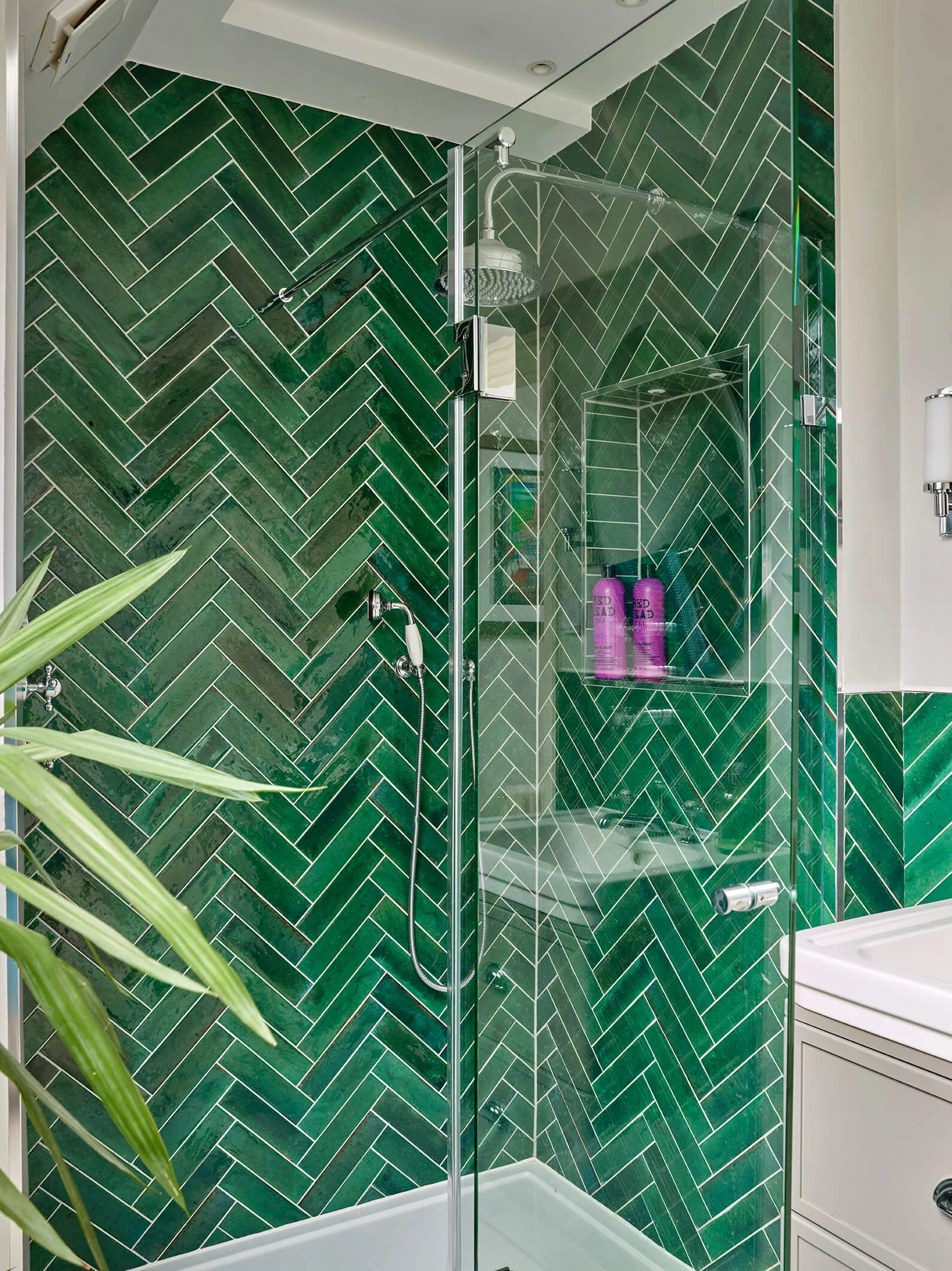 The bathrooms have been carefully designed with a range of SACW tiles, to create impact with practicality. One has been enhanced by our rich and glossy Loom Green tiles arranged in a striking herringbone format. Another showcases the beautiful Coliseum Statuario polished marble-effect porcelain slabs, with a classic running vein format. A niche in New York marble hexagons is the perfect way to create a stylish space to hold toiletries, perfectly complementing the overall design.