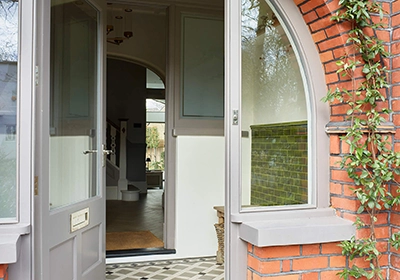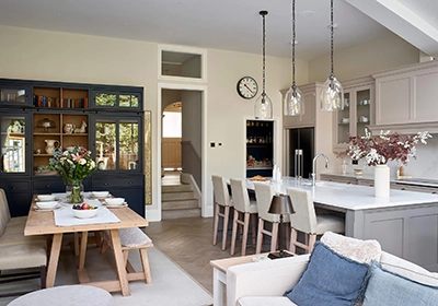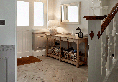 For this Chiswick project, the entire ground floor has been transformed with our stunning wood-effect Legna Leggero herringbone tiles, creating a sense of space and seamless flow throughout. To add to the grandeur of the entrance, a Victorian-style porch has been added, featuring a traditional blend of Norwich in Black, Holkham Dune, and Dover White, all framed by a Bennet border.